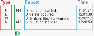 The report window lists all events (subsequently called “reports”). Reports are created e.g. as a result of error situations and displayed either in a notification field (message box) or in the event window. When a simulation is started or stopped, a report (as notification) is shown in the event window, informing whether the simulation has been started or stopped.