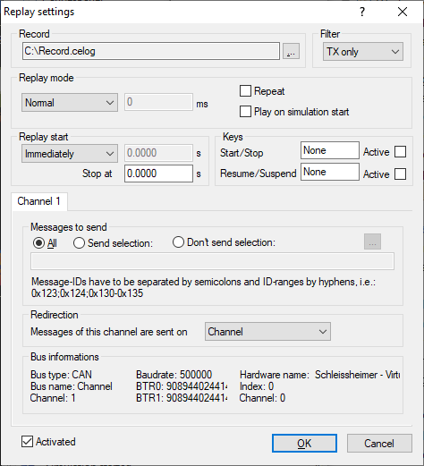Options in the replay settings window depend on the loaded recording. The channels included in the recording are displayed in separate tabs. Depending on the bus type of the recorded channels, different replay settings are available.